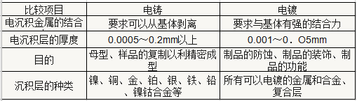 電鑄與電鍍的最大不同是,電鍍的產品是被鍍件和產品的復合體,而電鑄則只是以電沉積層為所需要的制品,最終要將鍍層與母型脫離。電鑄與電鍍的區別如下表: